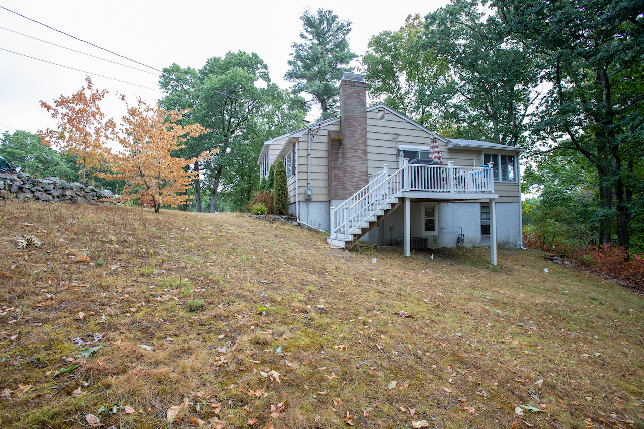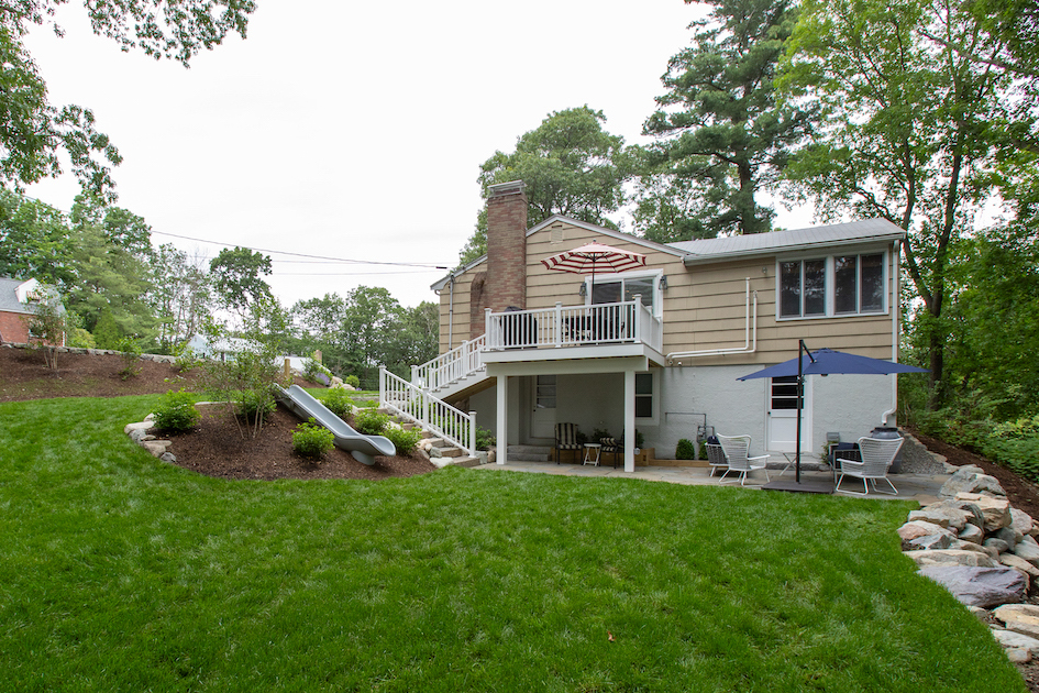 The scope included tree removal, site clearing, earthwork, natural stone boulder retaining walls, reclaimed granite stairs and steps, deck improvements, an irregular flagstone/bluestone patio, children’s play equipment, irrigation system, new plantings, and a brand new lawn.