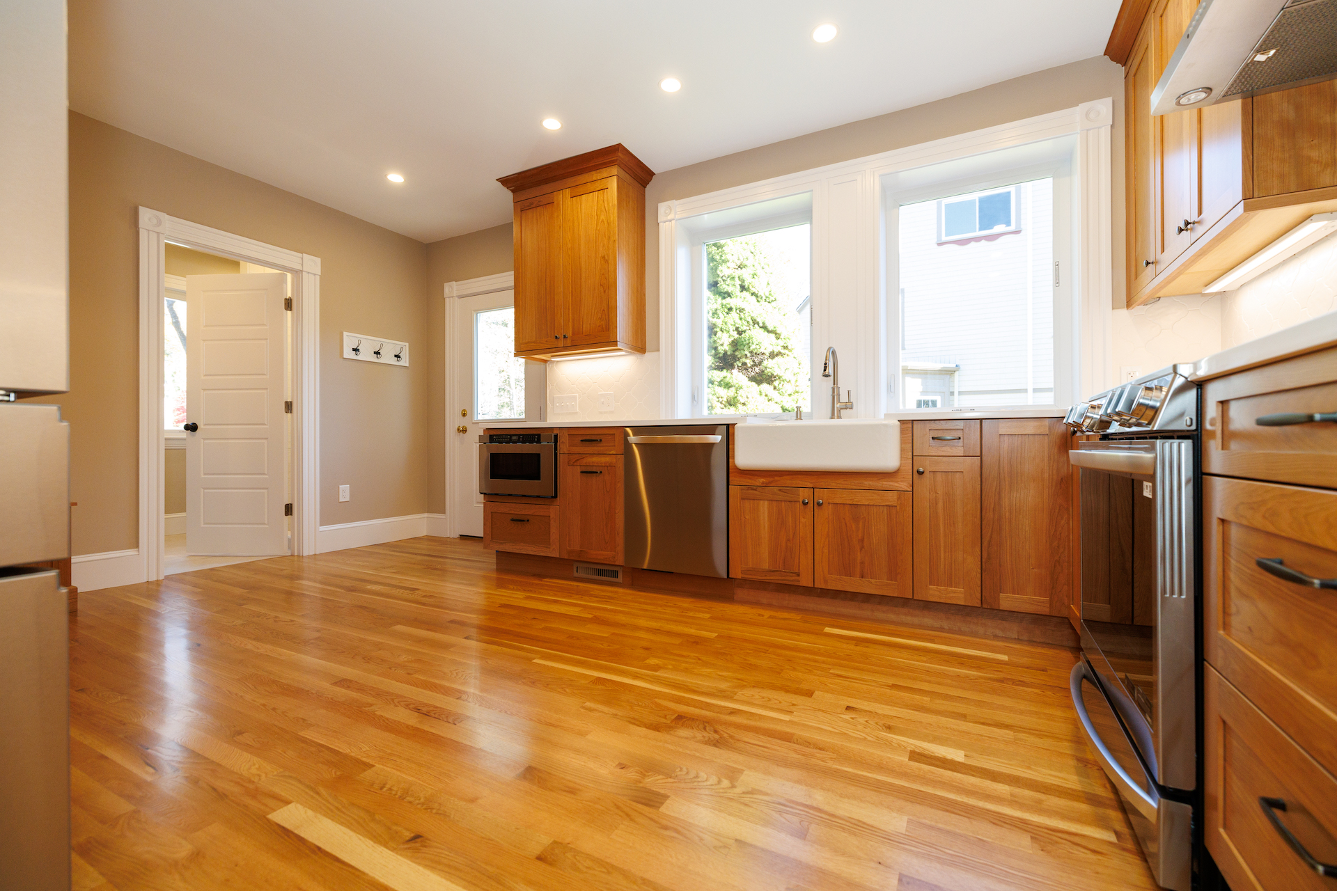 In the kitchen area we replaced the exterior door, adjusted the window positioning and style, simplifying the view, and maximizing light flow into the space. We removed the old tile floor, and installed new hardwood to match the existing hardwood throughout the home, creating a clean and uniform floor plane. The Cambria Smithfield counter tops pop nicely against the natural cherry shaker style cabinets (with clear stain). We replicated the existing door style and decorative trim to keep the build true to its roots.