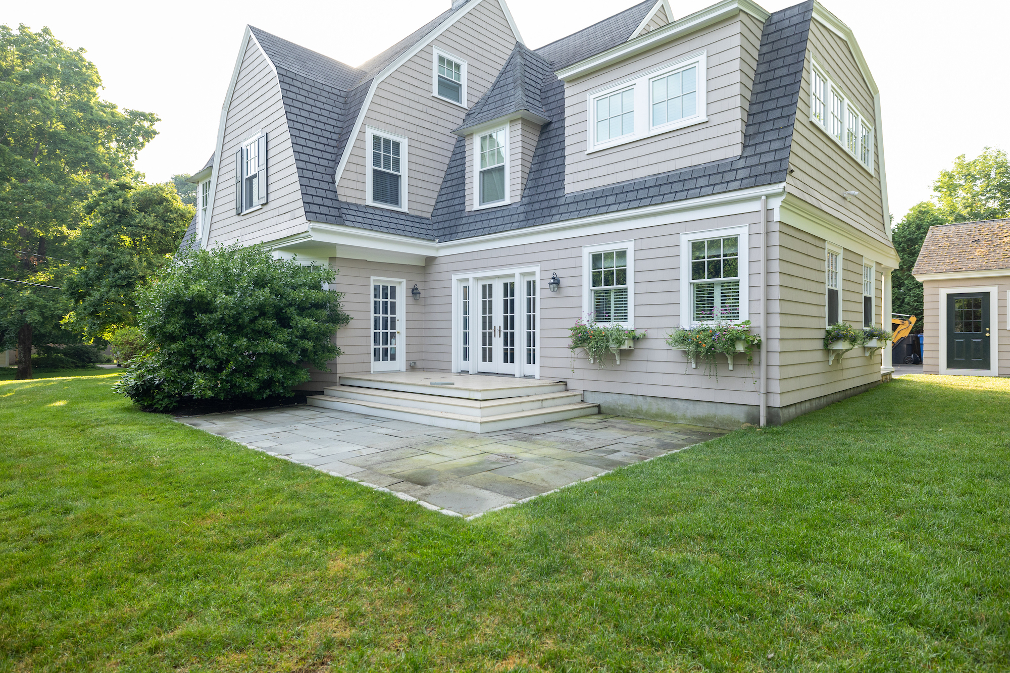 This outdoor living area creates a charming space to host and entertain. French doors from dining room open to a bluestone landing, with fieldstone stairs descending to a spacious bluestone patio. This inviting retreat features a dining area and cozy living space anchored by a rustic wood-burning fieldstone fireplace. Surrounded by lush plantings, and evergreen screen planting along the property line, it’s the perfect spot to entertain, relax, and reconnect with nature.