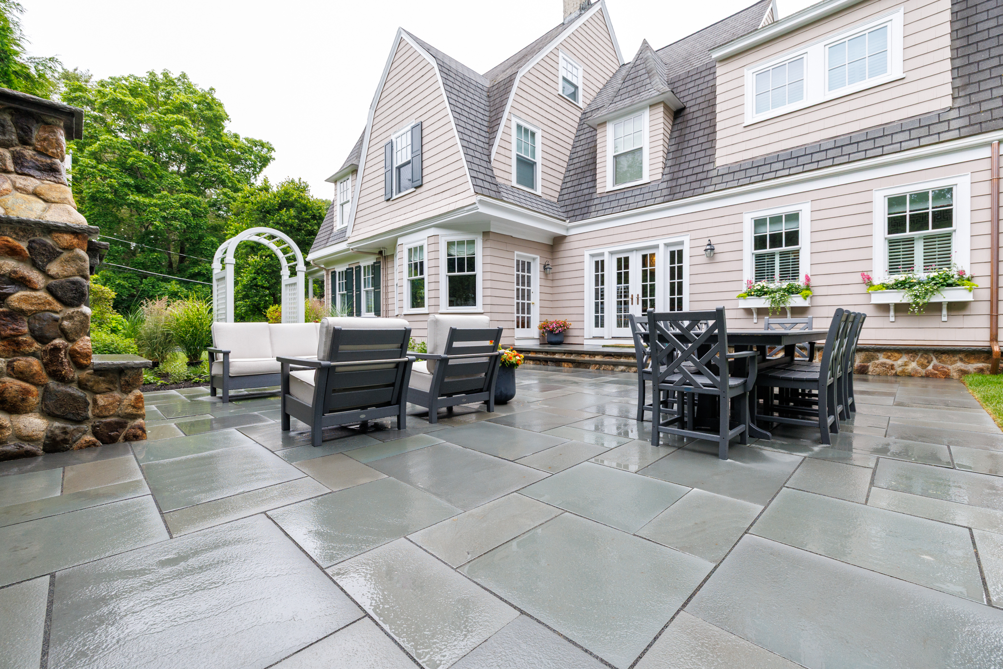 This outdoor living area creates a charming space to host and entertain. French doors from dining room open to a bluestone landing, with fieldstone stairs descending to a spacious bluestone patio. This inviting retreat features a dining area and cozy living space anchored by a rustic wood-burning fieldstone fireplace. Surrounded by lush plantings, and evergreen screen planting along the property line, it’s the perfect spot to entertain, relax, and reconnect with nature.