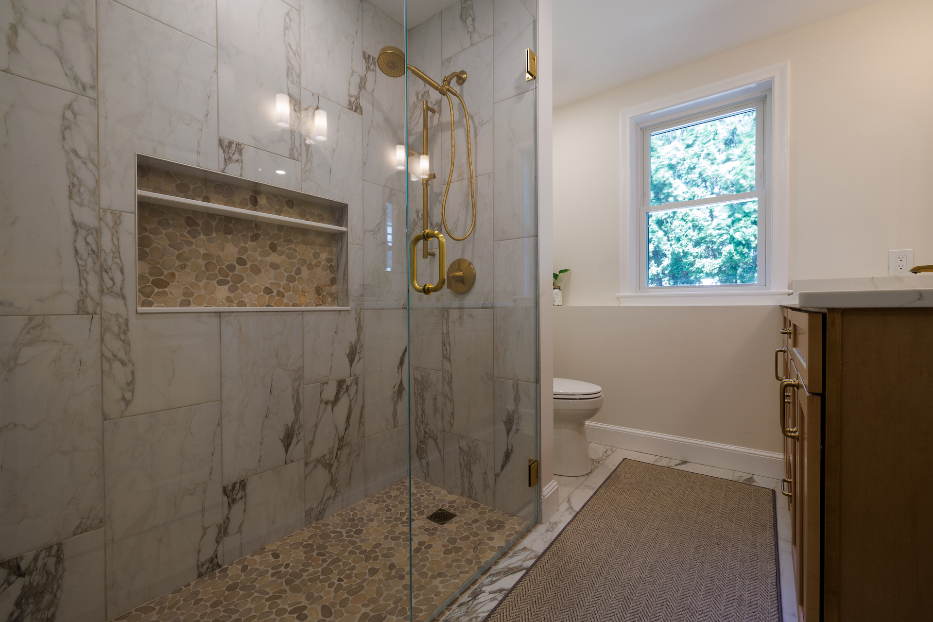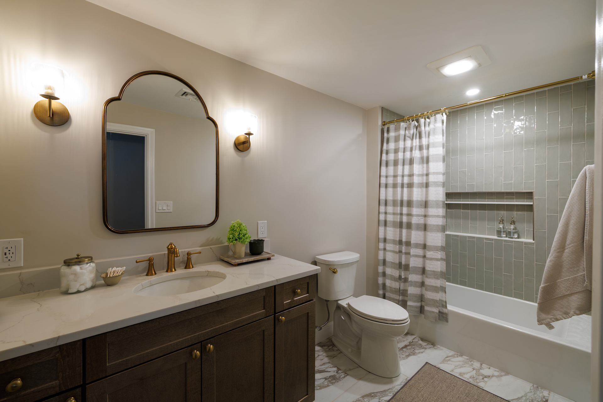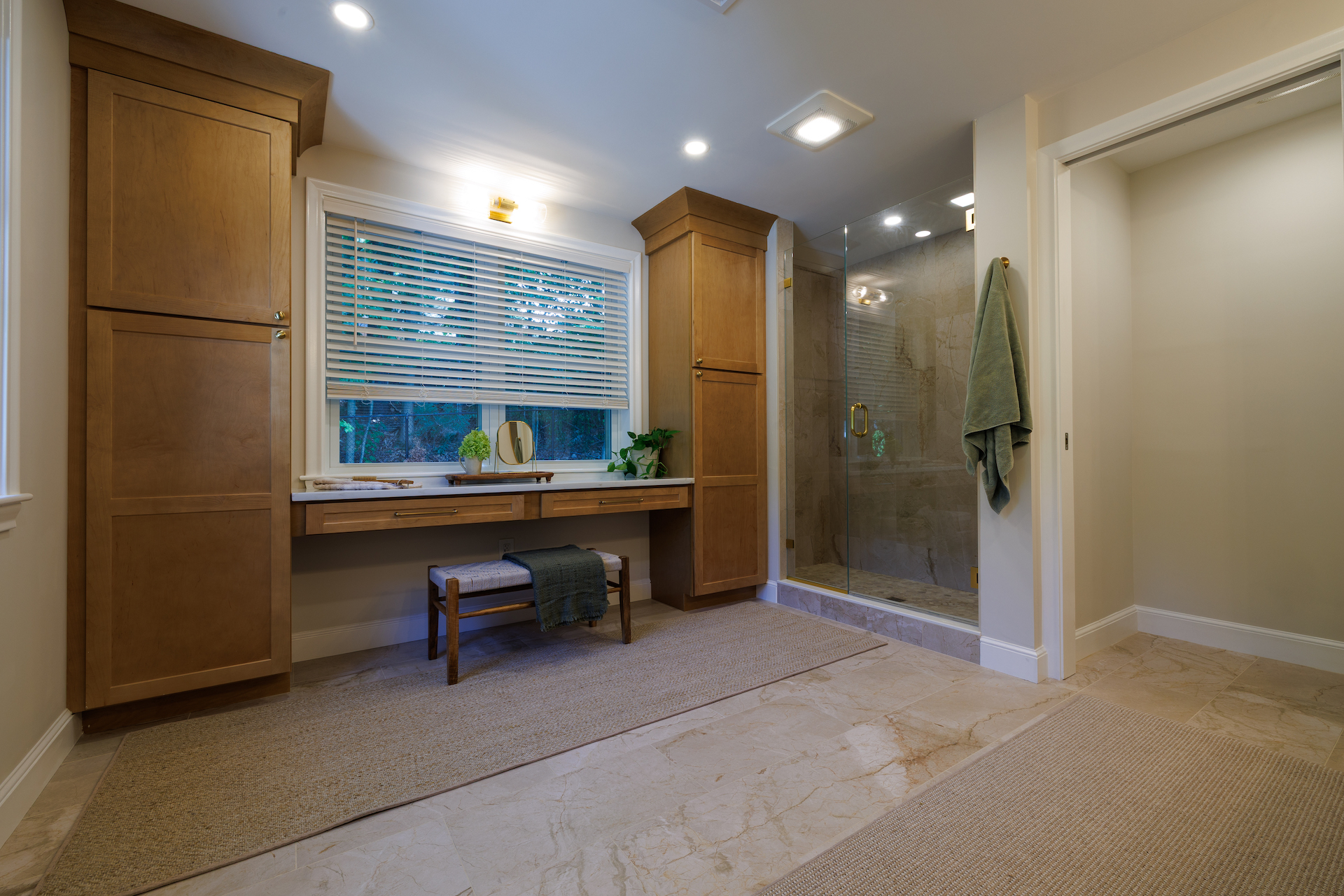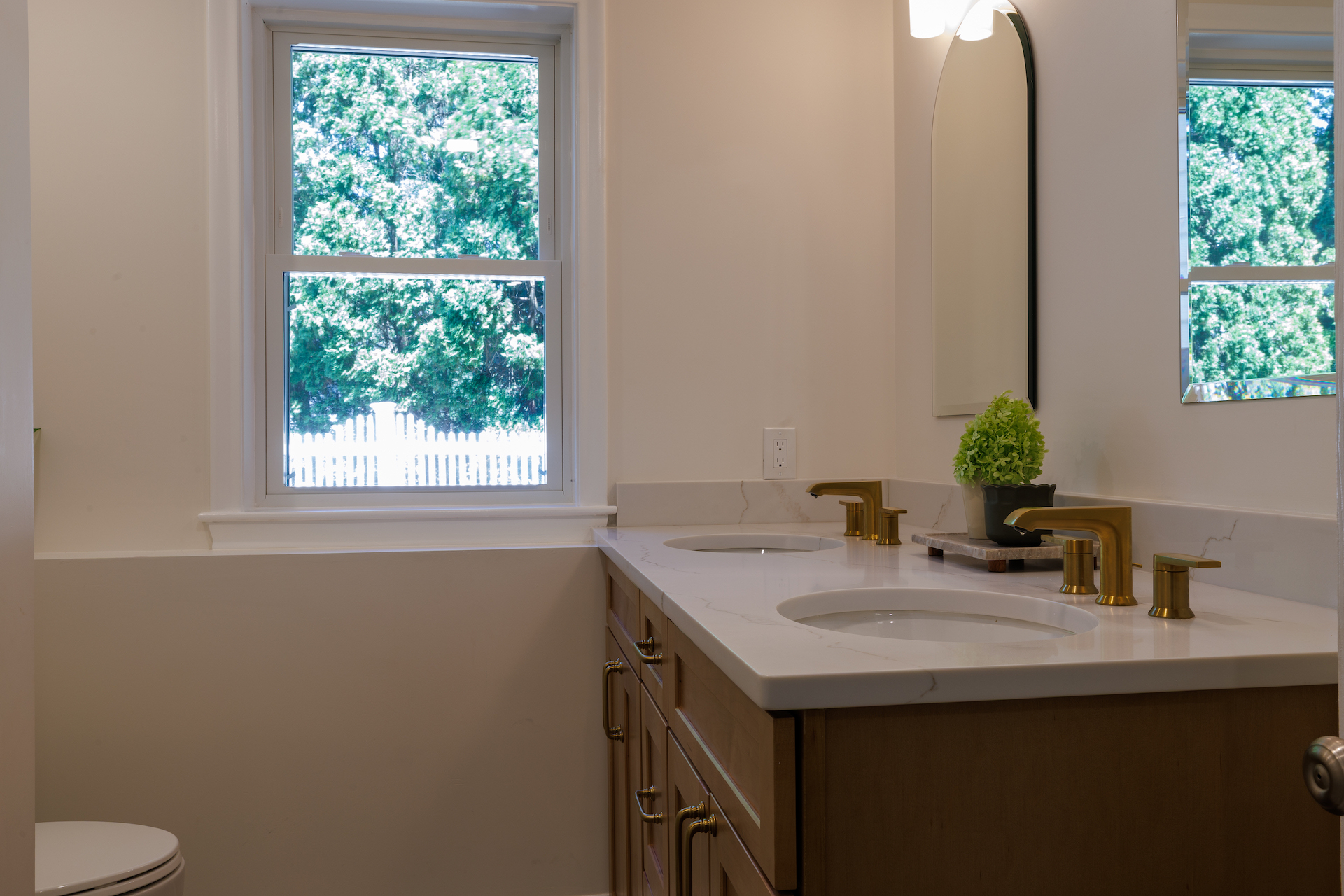 The master bedroom was reimagined as a luxurious master suite, seamlessly integrating a spacious new bathroom within the rear addition and a generous walk-in closet created by relocating the first-floor common bathroom. The elegant master bathroom features a dedicated makeup station flanked by sleek linen cabinets, a walk-in tile shower with custom-crafted glass doors, a private water closet, and a double-wide vanity offering abundant counter space and under-cabinet storage. This serene retreat combines functionality with sophistication, perfect for unwinding after a long day. The relocated common bathroom, now equipped with a tub and tiled shower surround, is thoughtfully designed to meet the needs of young families, balancing practicality and style.