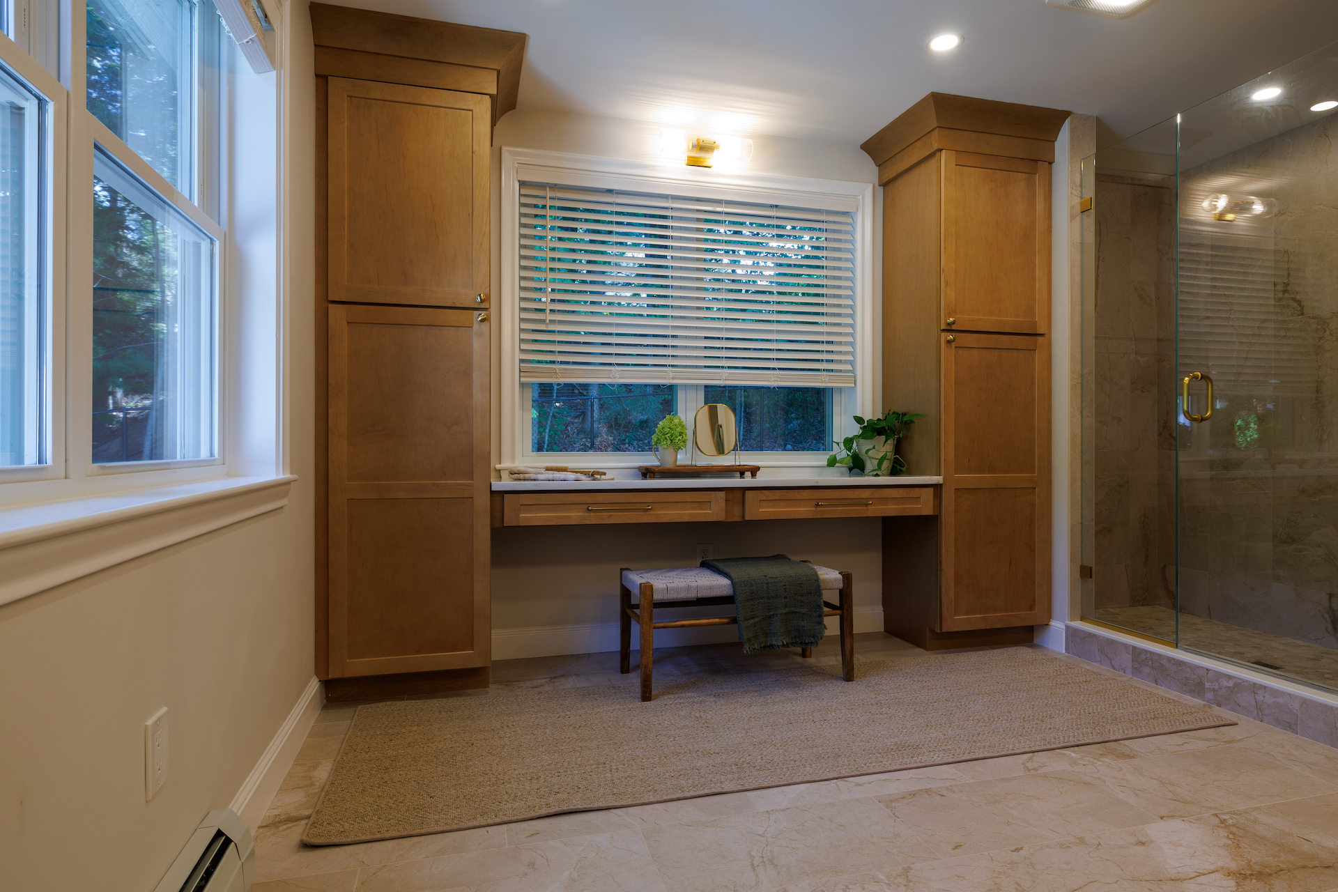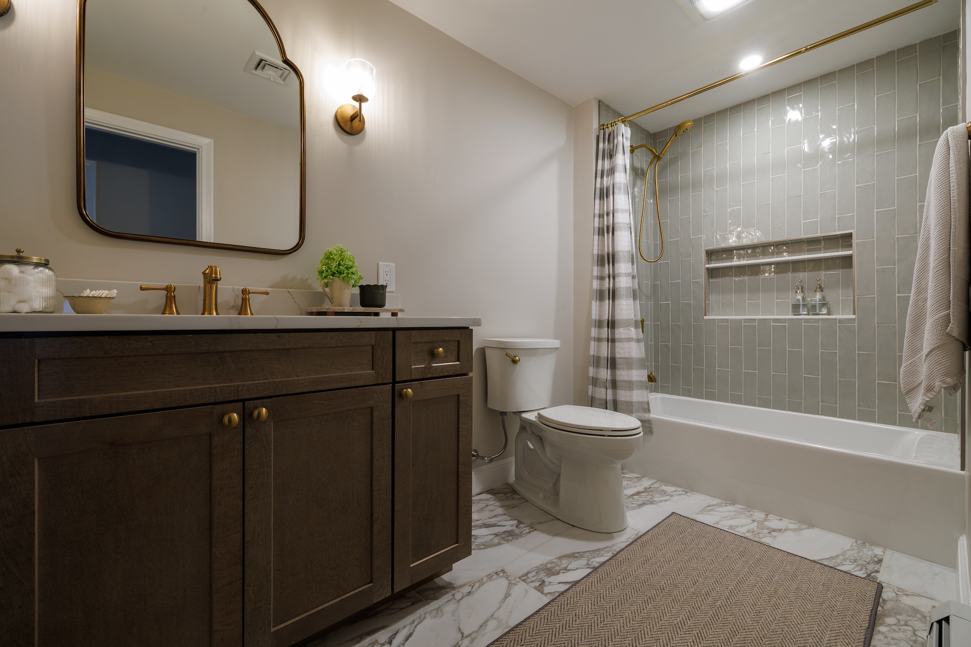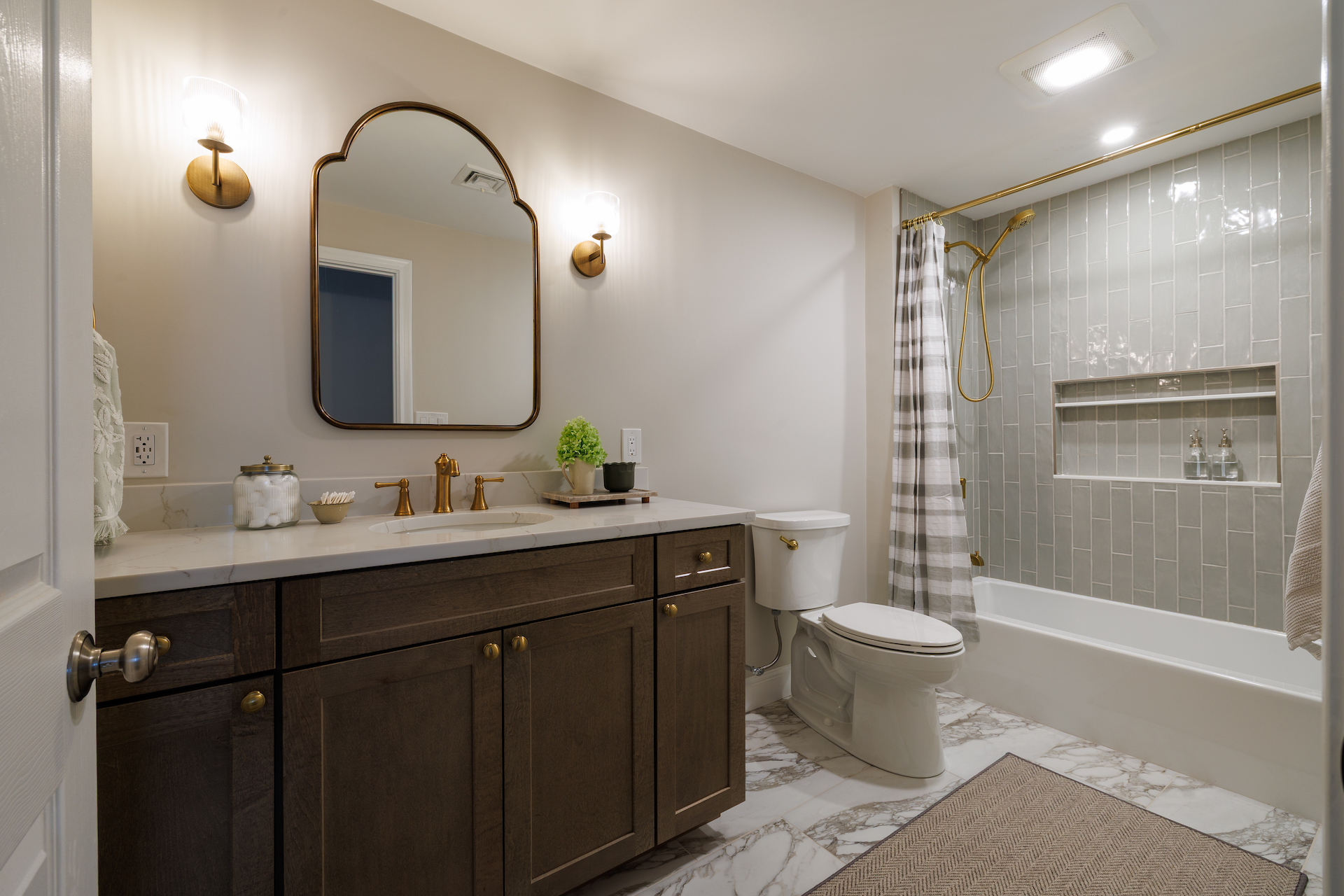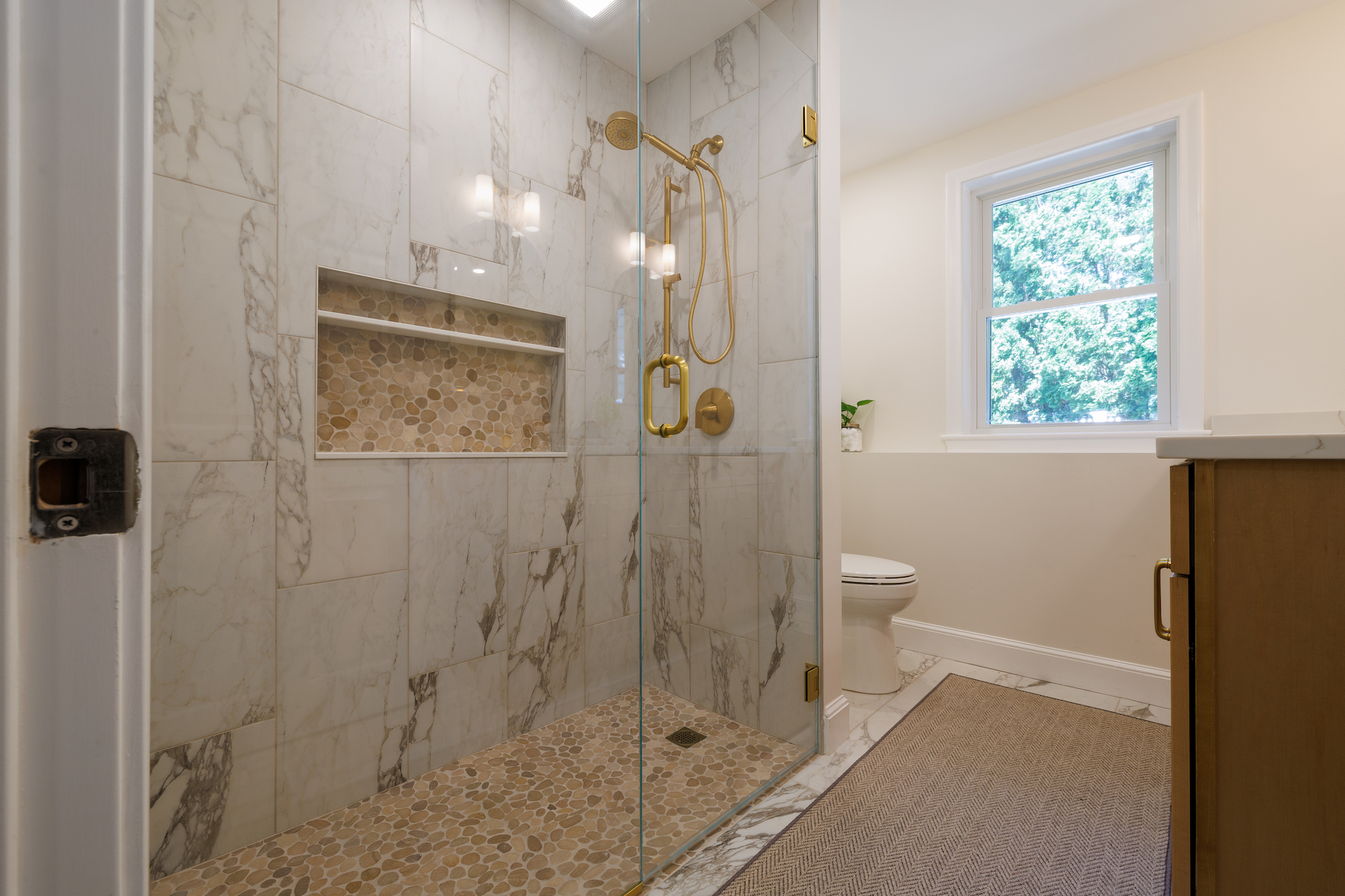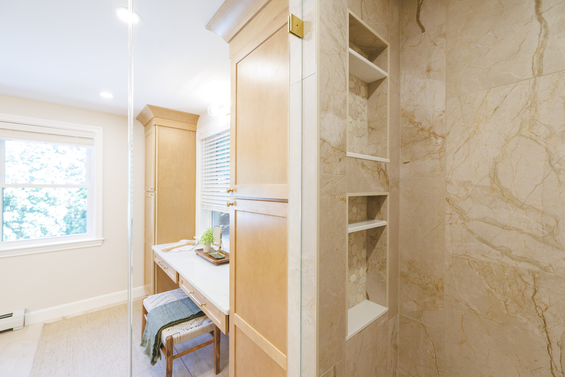 The master bedroom was reimagined as a luxurious master suite, seamlessly integrating a spacious new bathroom within the rear addition and a generous walk-in closet created by relocating the first-floor common bathroom. The elegant master bathroom features a dedicated makeup station flanked by sleek linen cabinets, a walk-in tile shower with custom-crafted glass doors, a private water closet, and a double-wide vanity offering abundant counter space and under-cabinet storage. This serene retreat combines functionality with sophistication, perfect for unwinding after a long day. The relocated common bathroom, now equipped with a tub and tiled shower surround, is thoughtfully designed to meet the needs of young families, balancing practicality and style.