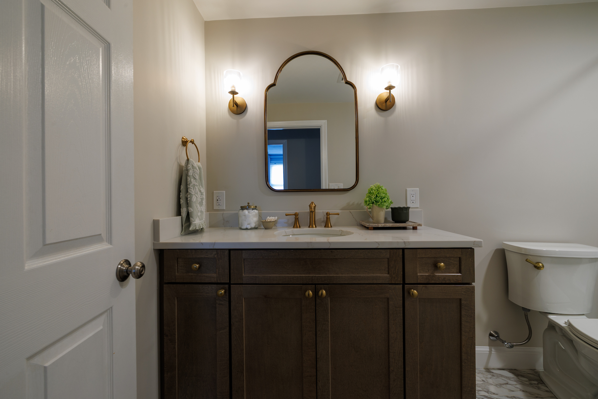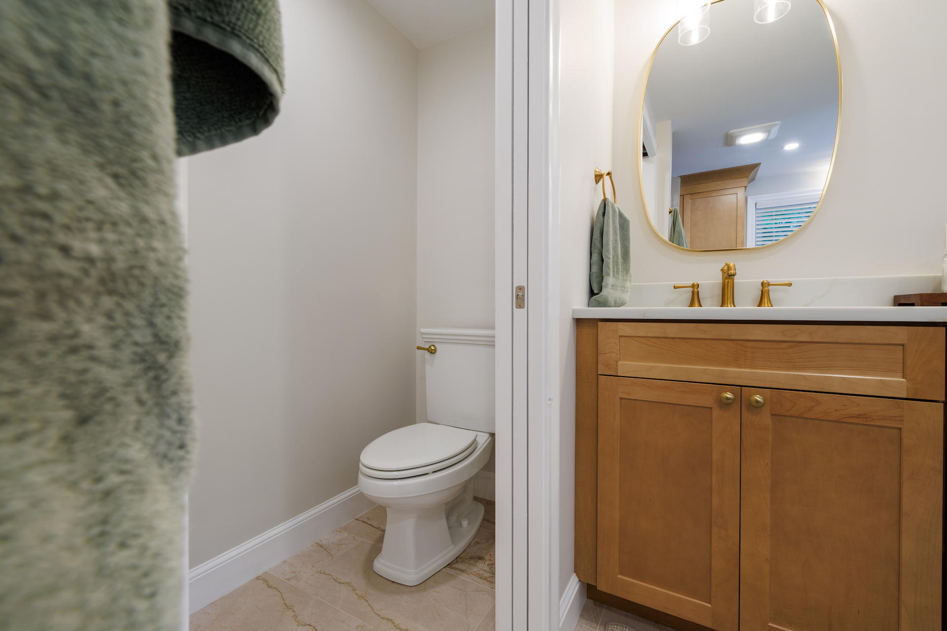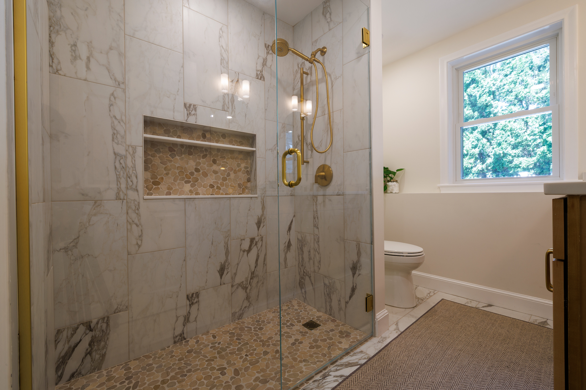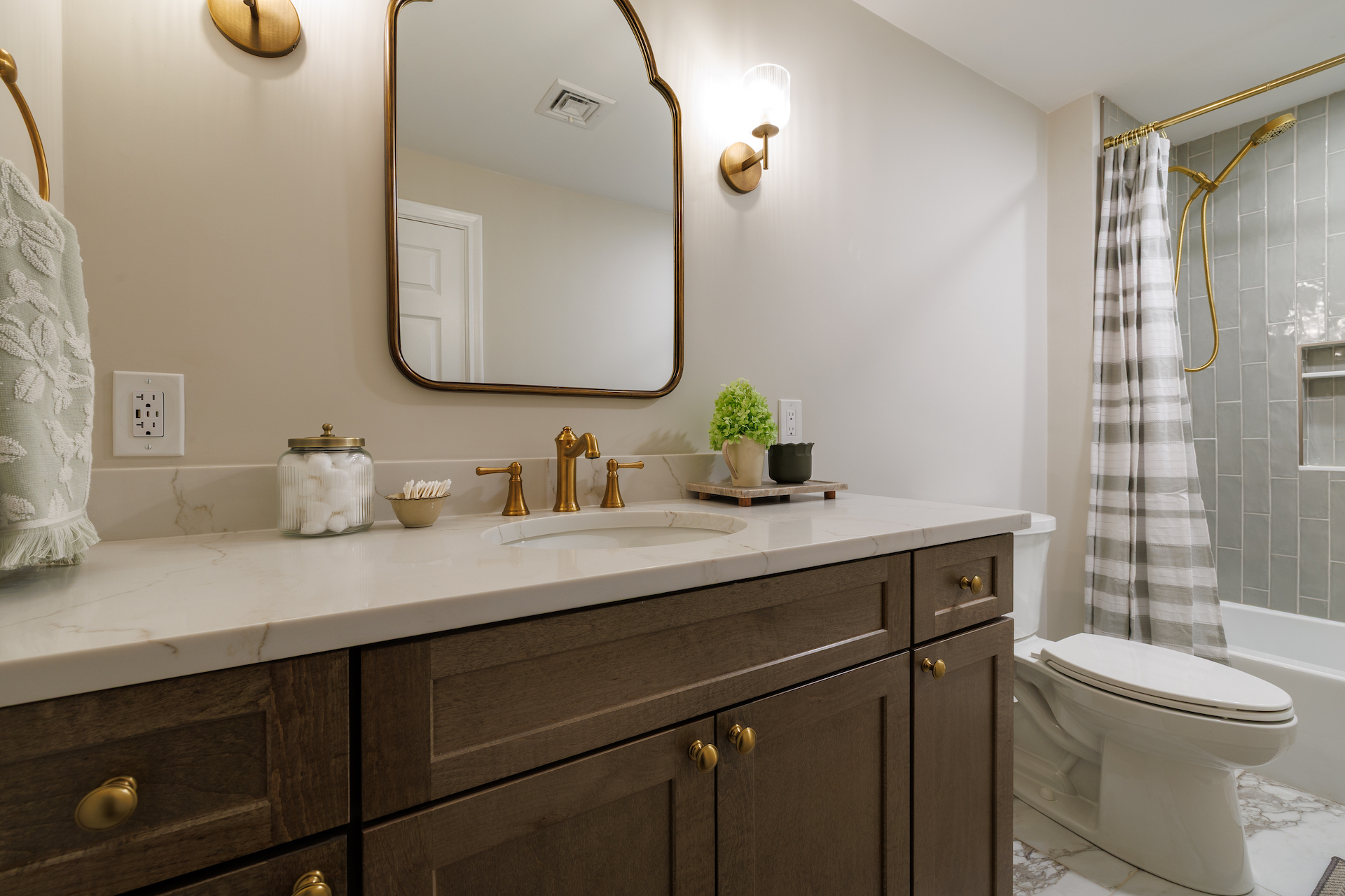 The master bedroom was reimagined as a luxurious master suite, seamlessly integrating a spacious new bathroom within the rear addition and a generous walk-in closet created by relocating the first-floor common bathroom. The elegant master bathroom features a dedicated makeup station flanked by sleek linen cabinets, a walk-in tile shower with custom-crafted glass doors, a private water closet, and a double-wide vanity offering abundant counter space and under-cabinet storage. This serene retreat combines functionality with sophistication, perfect for unwinding after a long day. The relocated common bathroom, now equipped with a tub and tiled shower surround, is thoughtfully designed to meet the needs of young families, balancing practicality and style.
