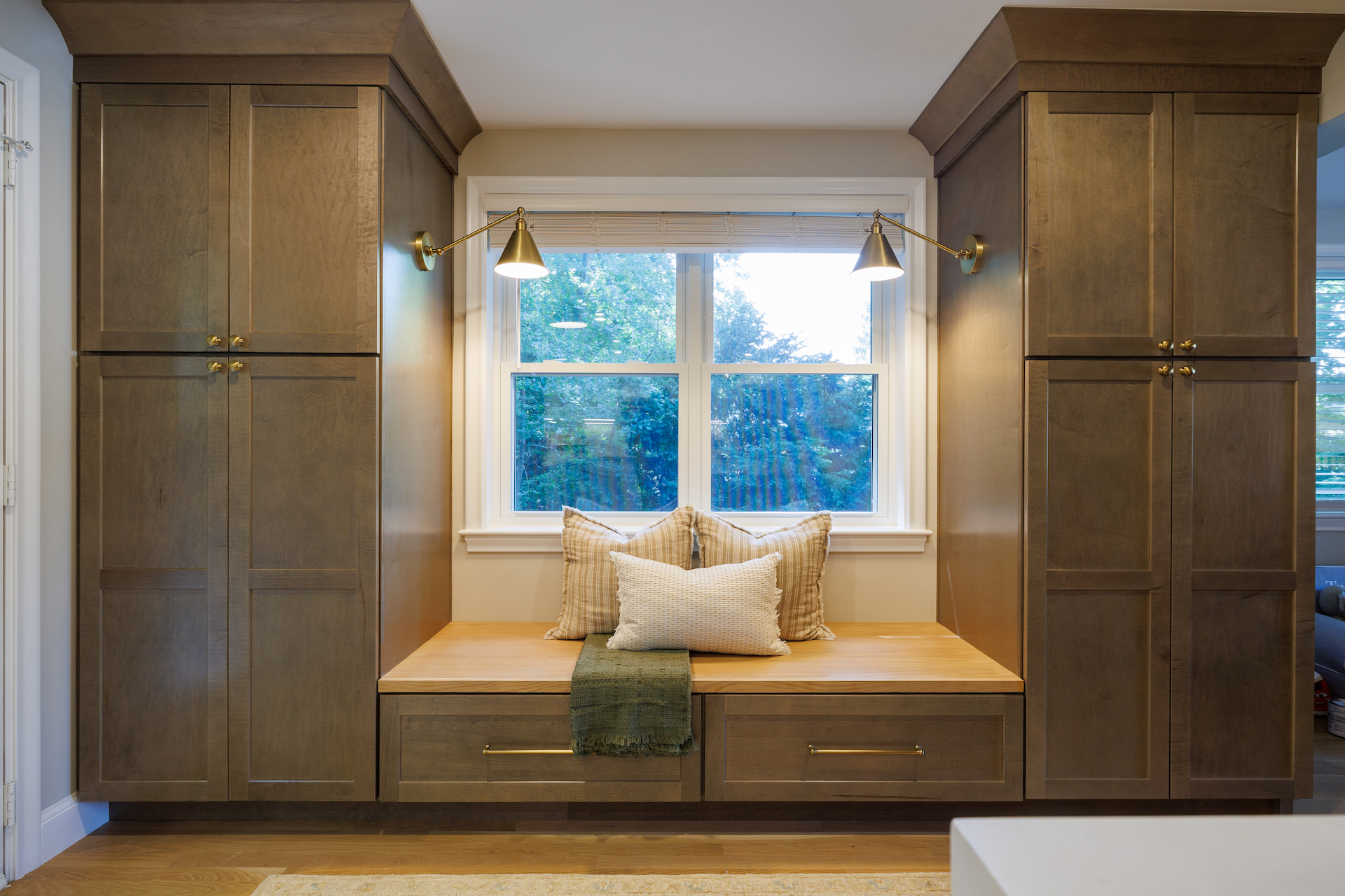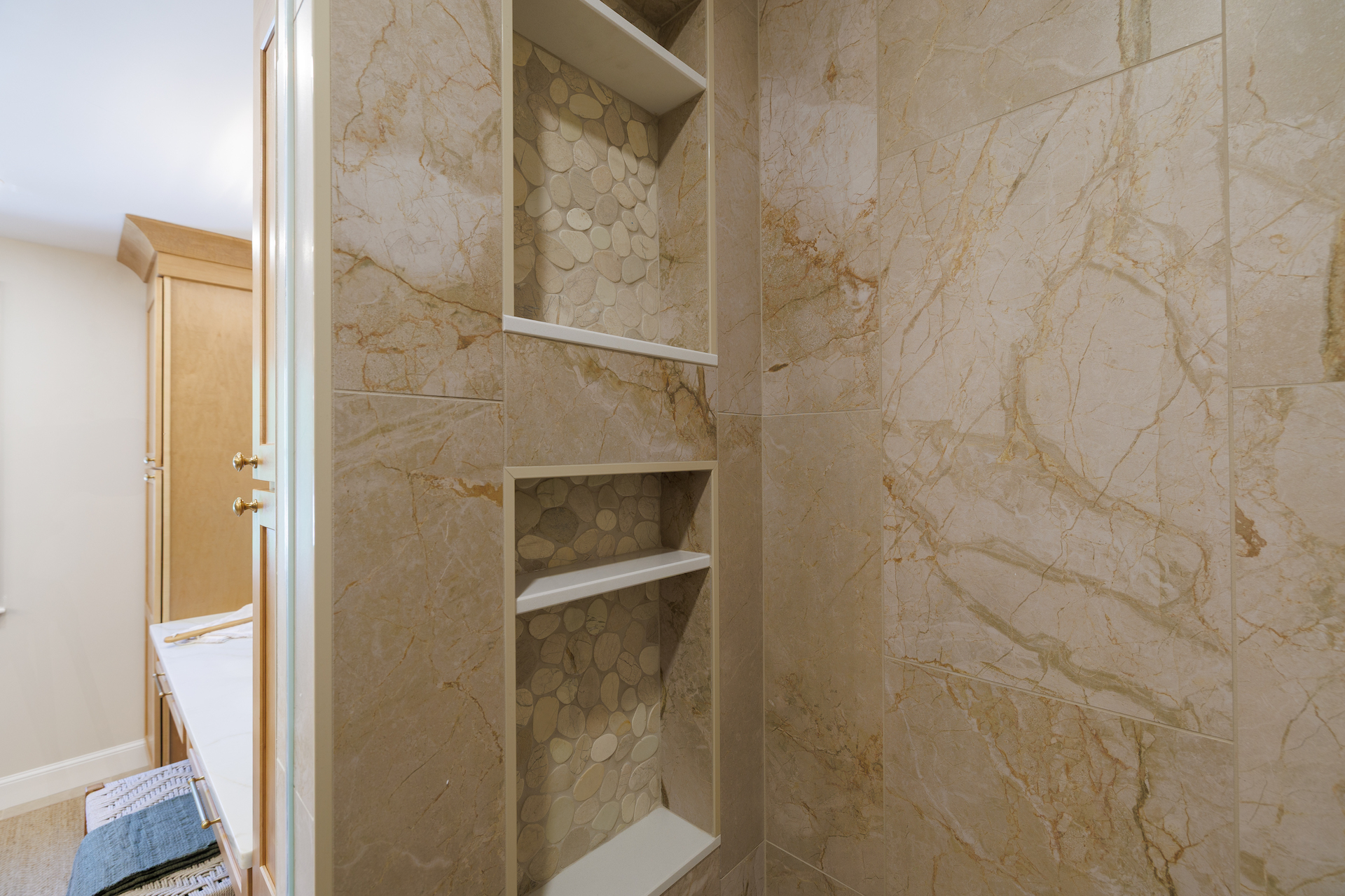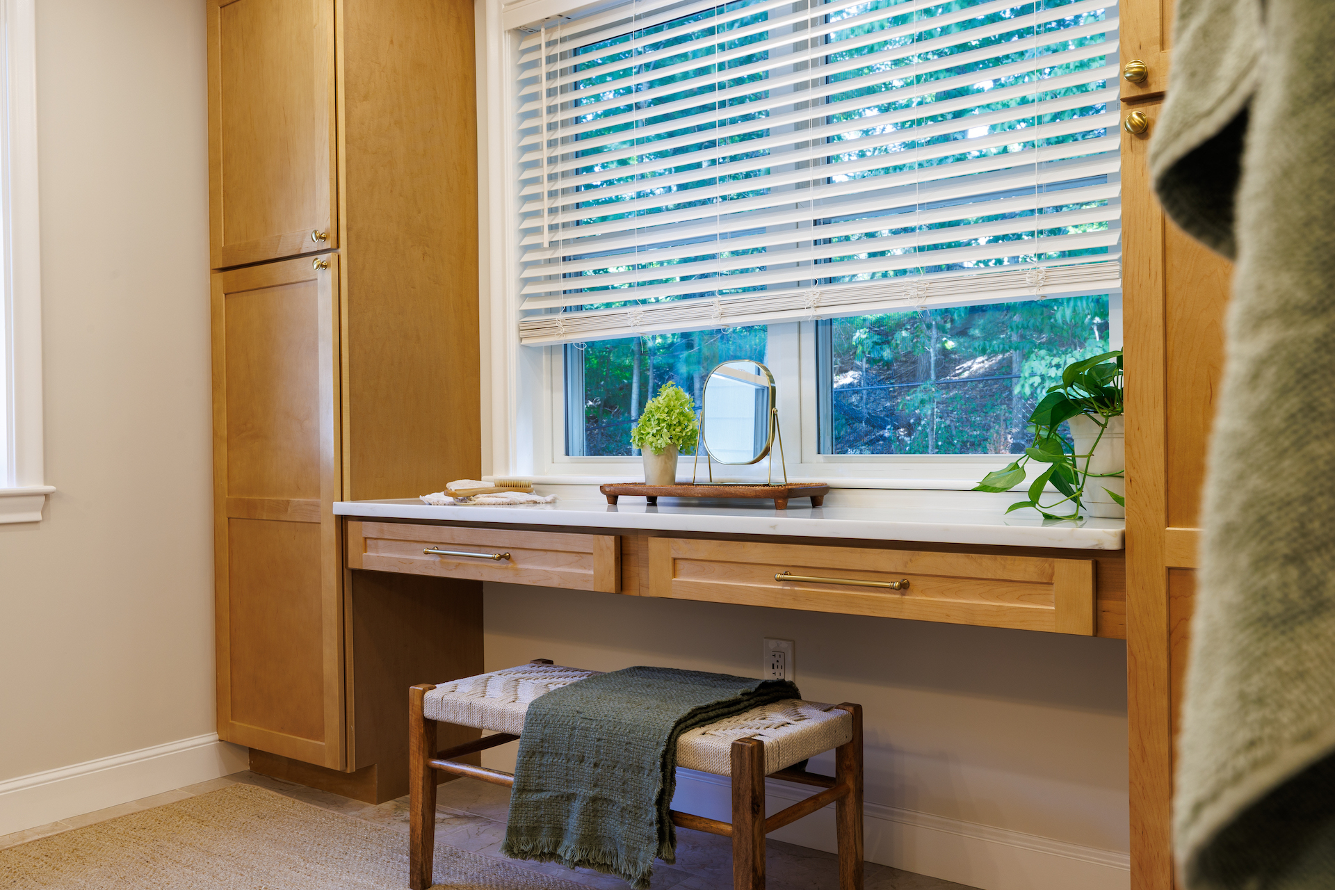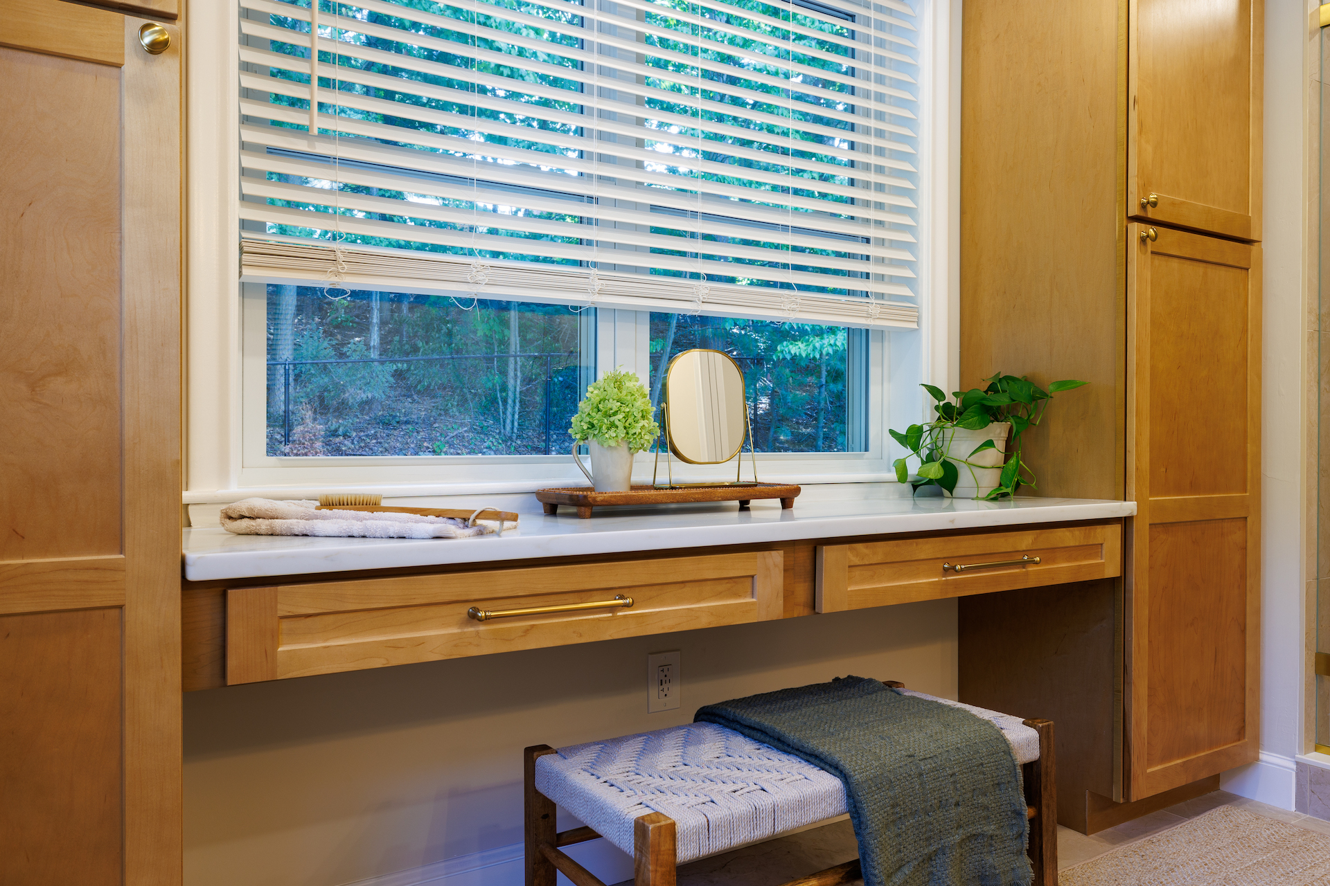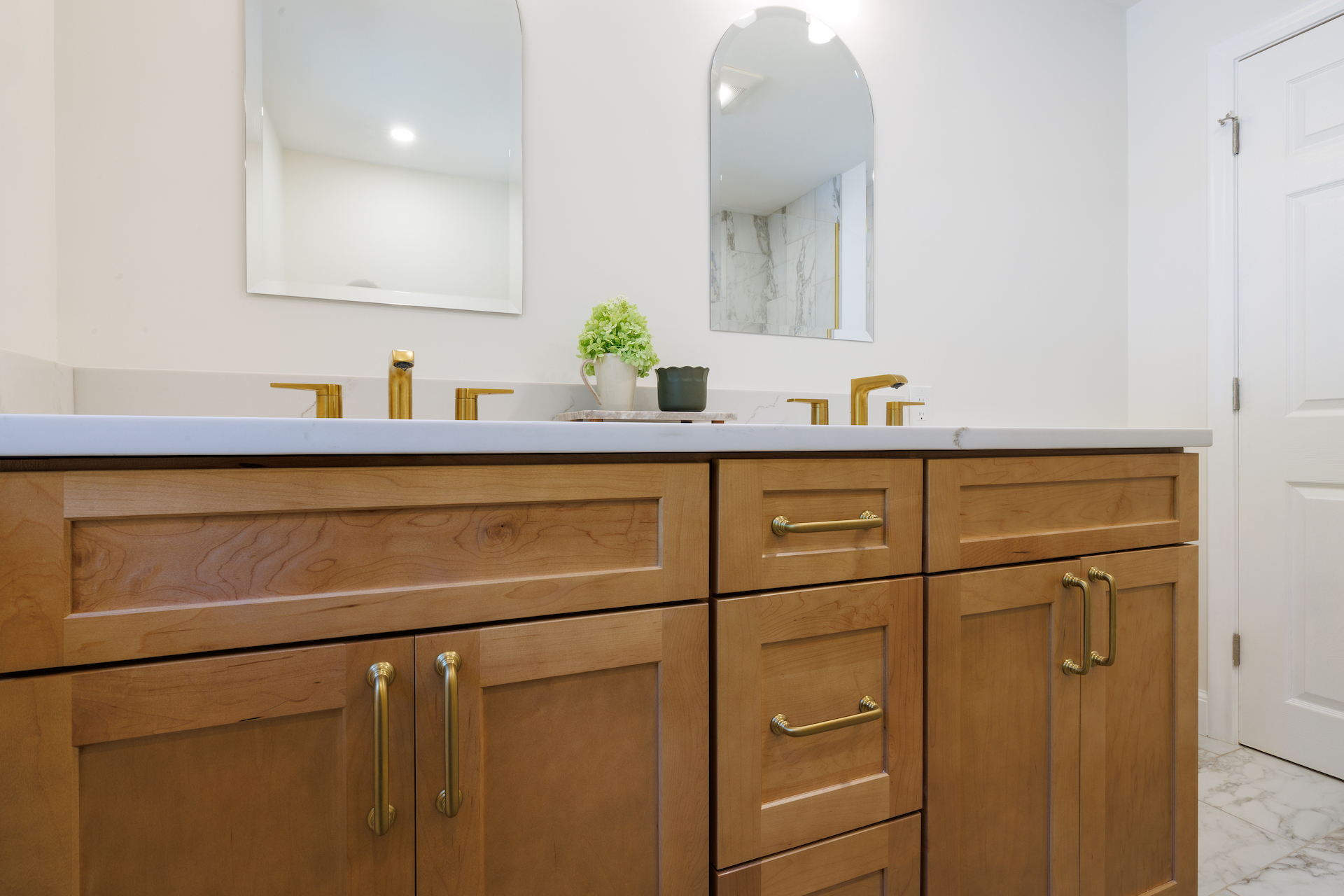 The master bedroom was reimagined as a luxurious master suite, seamlessly integrating a spacious new bathroom within the rear addition and a generous walk-in closet created by relocating the first-floor common bathroom. The elegant master bathroom features a dedicated makeup station flanked by sleek linen cabinets, a walk-in tile shower with custom-crafted glass doors, a private water closet, and a double-wide vanity offering abundant counter space and under-cabinet storage. This serene retreat combines functionality with sophistication, perfect for unwinding after a long day. The relocated common bathroom, now equipped with a tub and tiled shower surround, is thoughtfully designed to meet the needs of young families, balancing practicality and style.