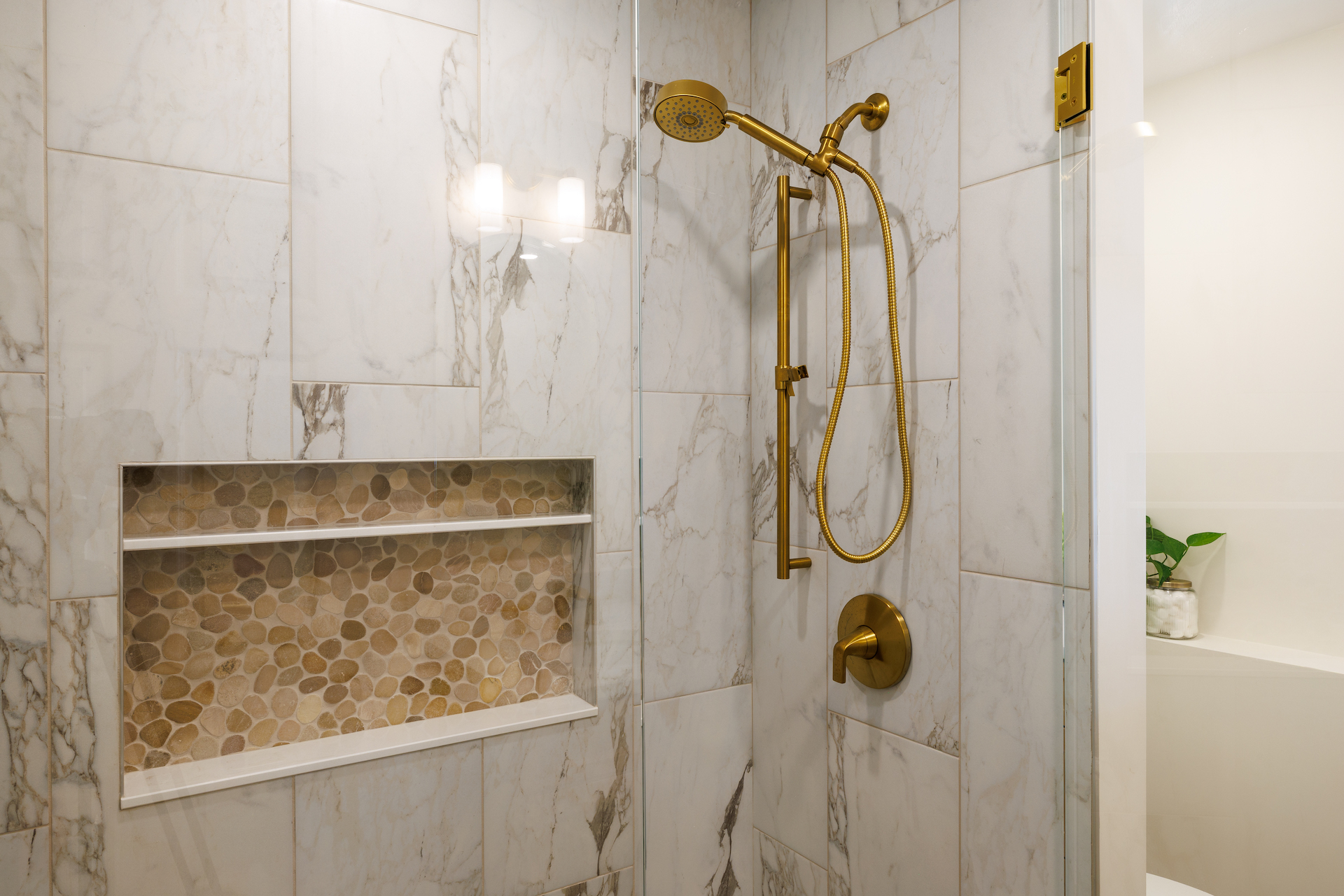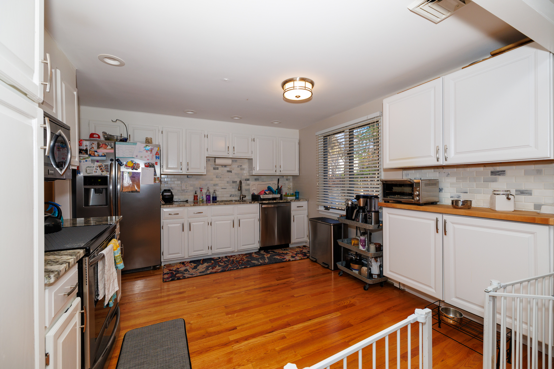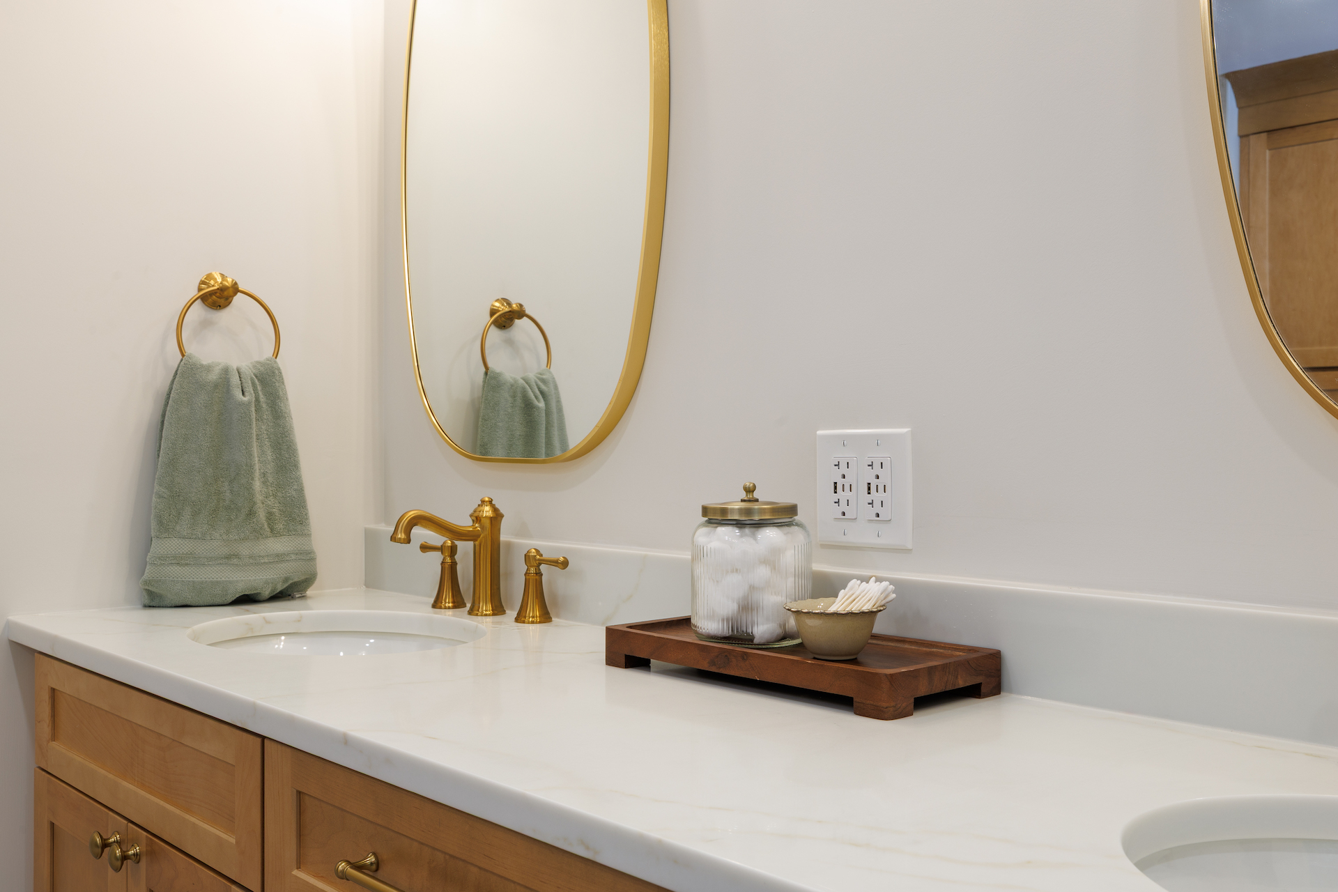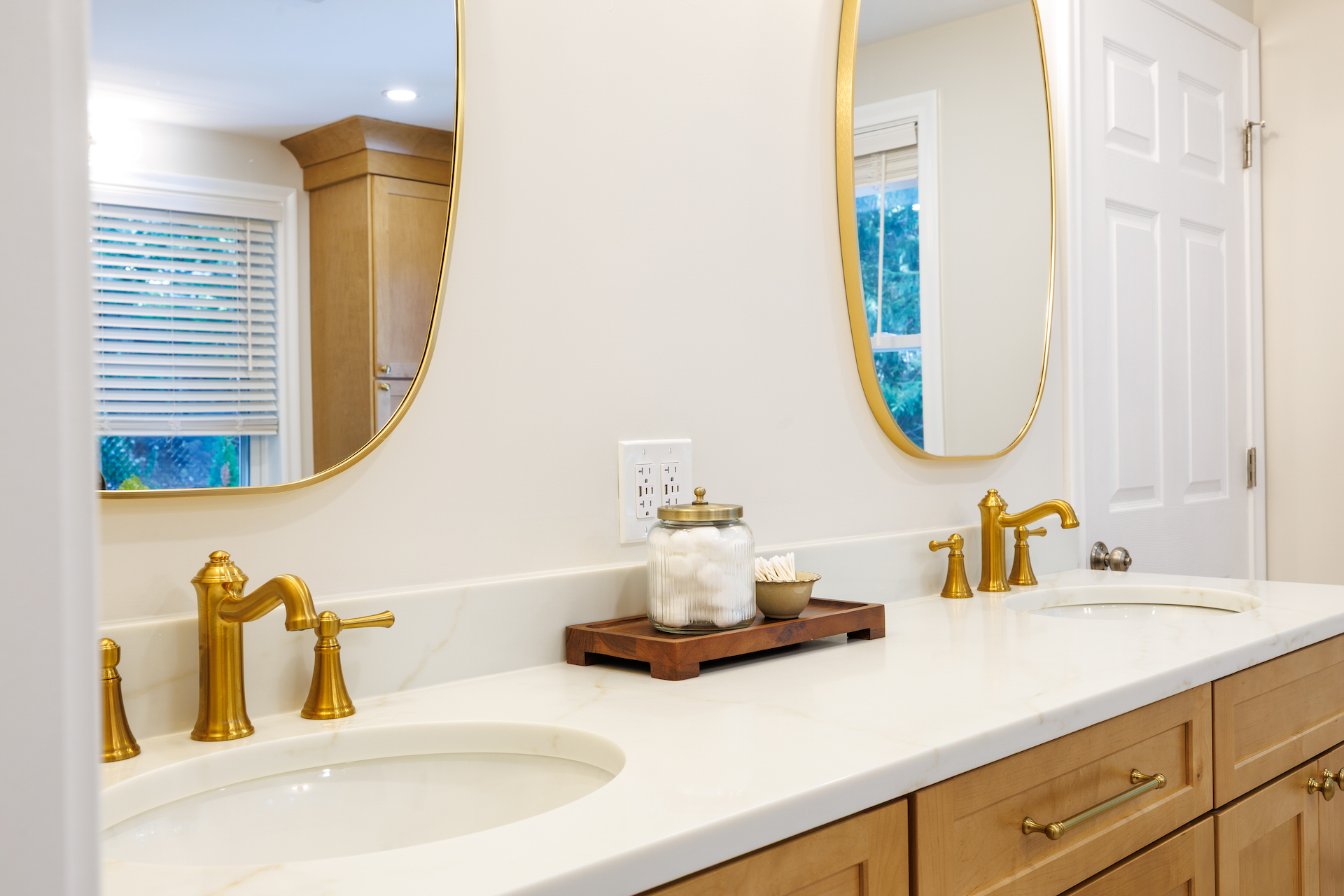 The master bedroom was reimagined as a luxurious master suite, seamlessly integrating a spacious new bathroom within the rear addition and a generous walk-in closet created by relocating the first-floor common bathroom. The elegant master bathroom features a dedicated makeup station flanked by sleek linen cabinets, a walk-in tile shower with custom-crafted glass doors, a private water closet, and a double-wide vanity offering abundant counter space and under-cabinet storage. This serene retreat combines functionality with sophistication, perfect for unwinding after a long day. The relocated common bathroom, now equipped with a tub and tiled shower surround, is thoughtfully designed to meet the needs of young families, balancing practicality and style.