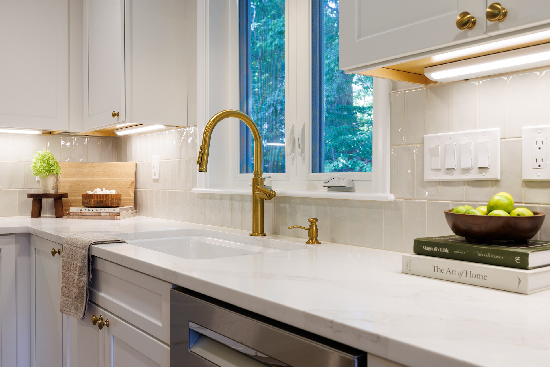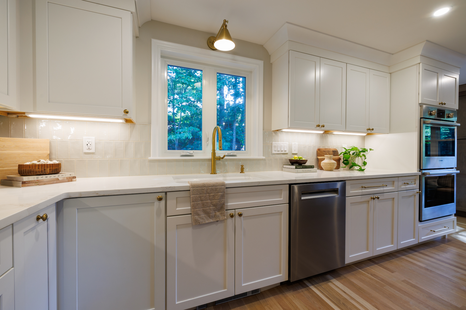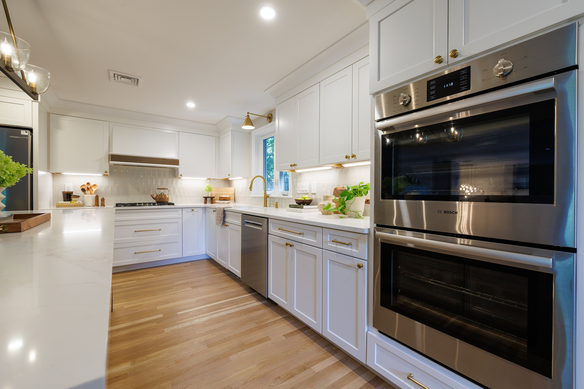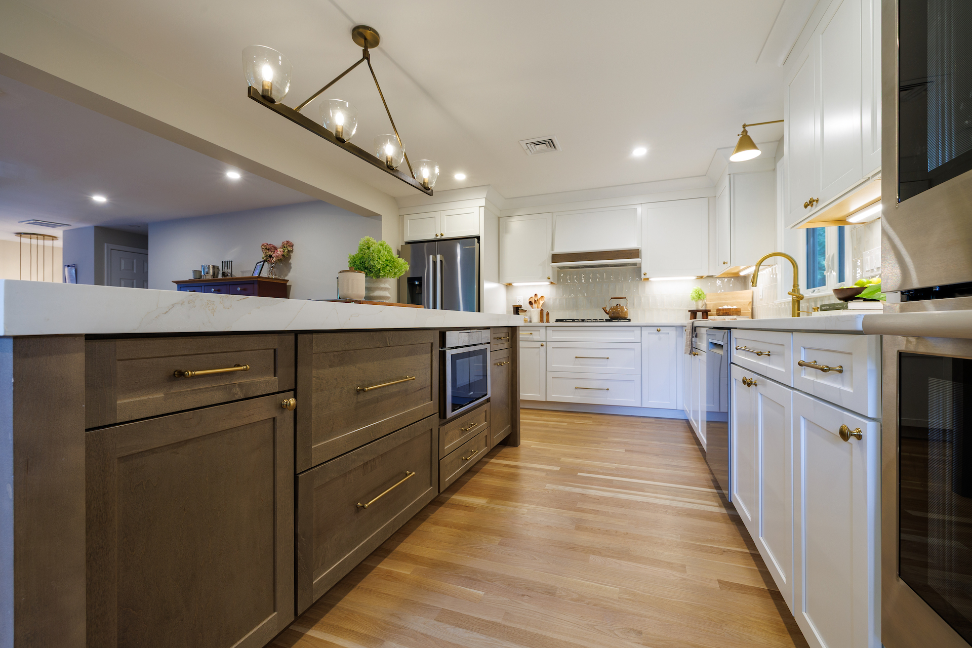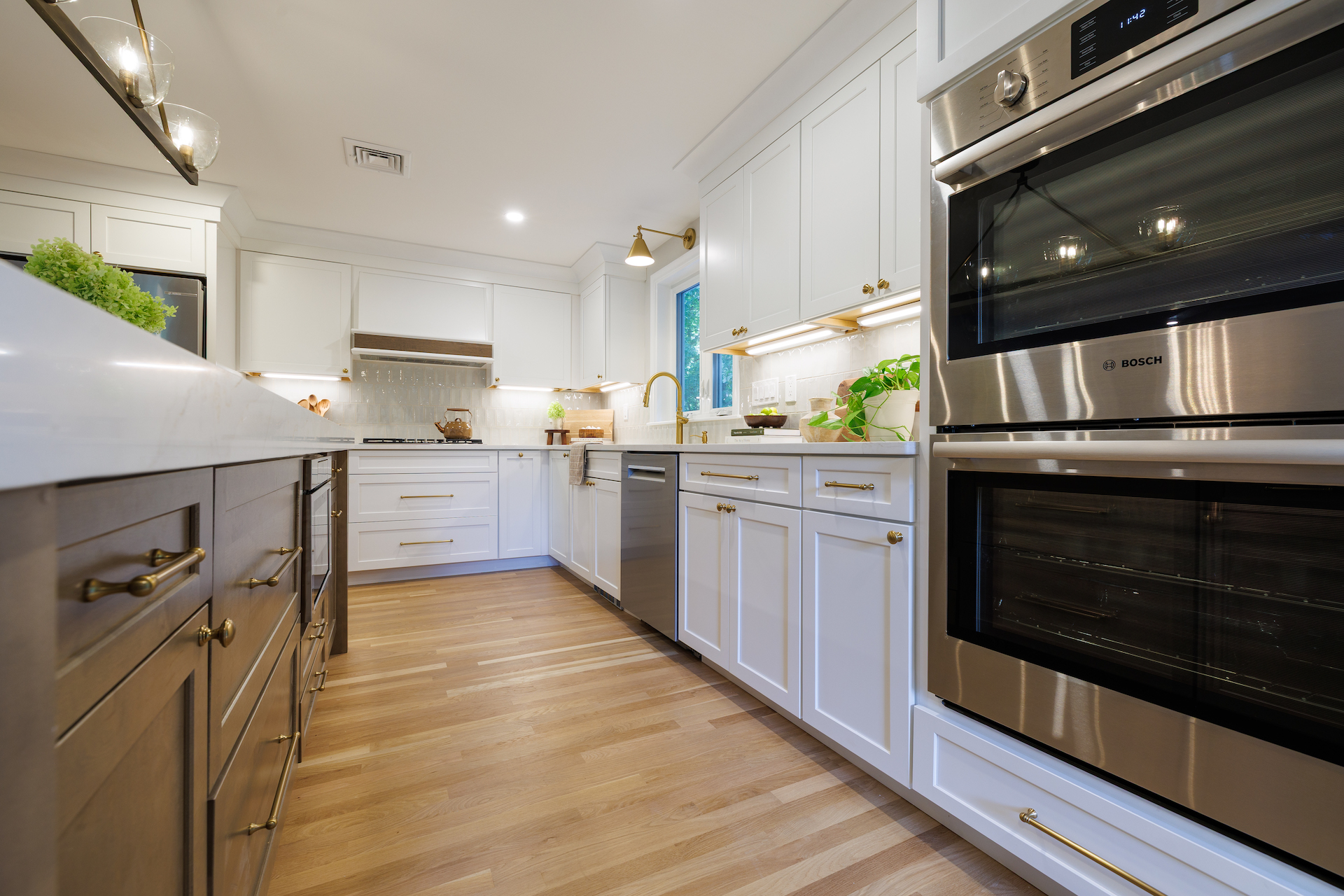 The redesigned kitchen, relocated to the new addition at the rear of the home, transforms the heart of this residence into a chef’s dream. Spanning a generous footprint, the open layout seamlessly connects to an expanded dining and family room, fostering effortless entertaining. Large windows above the sink and pantry, paired with a full-glass door, flood the space with natural light, creating a bright and welcoming atmosphere. The thoughtful design includes abundant perimeter cabinetry, a spacious 8-foot island, and a dedicated pantry area. A high-performance range vent ensures a fresh cooking environment, while the strategically placed refrigerator, range, microwave, sink, and dishwasher maximize efficiency. Flanking double ovens offer ample baking capacity for family gatherings. White oak hardwoods create a warm, cohesive floor, complemented by two-tone cabinetry—painted linen perimeter cabinets paired with a rich maple almond island. Sleek 3-inch Glacierland quartz countertops anchor the island, while a modern tiled backsplash adds subtle sophistication. Elegant chandeliers, decorative sink fixtures, and under-cabinet lighting infuse warmth and charm, making this kitchen as functional as it is beautiful.