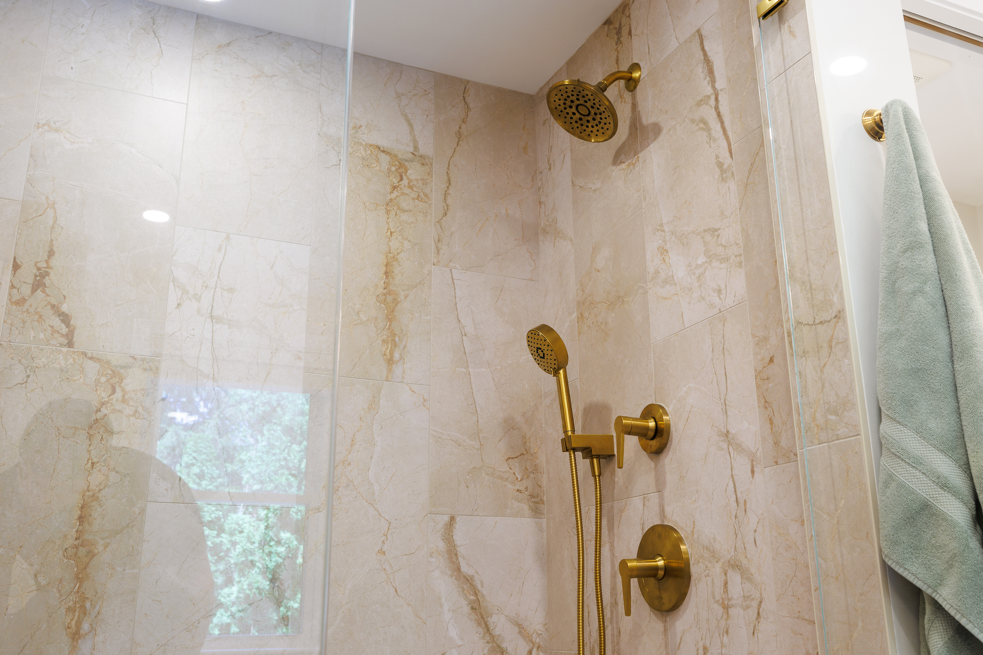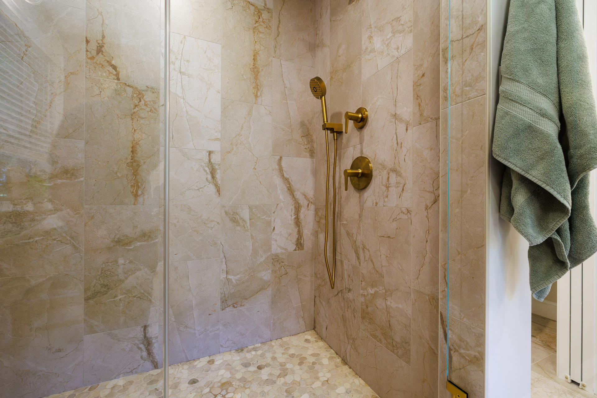 The newly crafted basement guest suite offers a welcoming haven for visitors, featuring a spacious walk-in closet and a modern full bathroom with a curbless tile shower enclosed by custom-crafted glass doors. Designed for comfort and efficiency, the suite is equipped with an independently zoned Mitsubishi recessed ceiling unit, providing personalized heating and cooling for year-round comfort. This versatile space, bathed in soft natural light, creates an inviting retreat for guests or extended family, blending privacy with contemporary elegance.